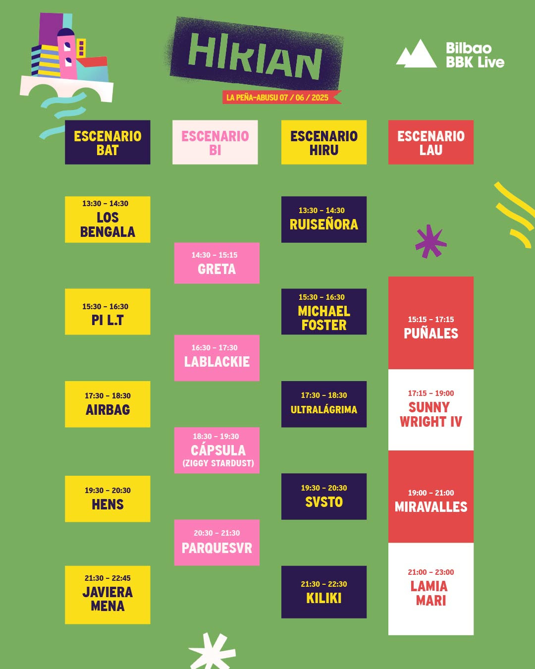 Este sábado llega al barrio bilbaíno de La Peña la sexta edición del Hirian. Será el último adelanto del Bilbao BBK Live que se celebrará en Kobetas un mes después. Será un total de 18 bandas las que se suban a los cuatro escenarios del festival durante todo el día. Tres de los escenarios compartirán parque y es que estarán en el Parque Ibaider. Mientras el otro escenario restante estará justo en frente del parque, en la Campa Ibaizabal. Así quedan los horarios del Hirian en sus diferentes escenarios.